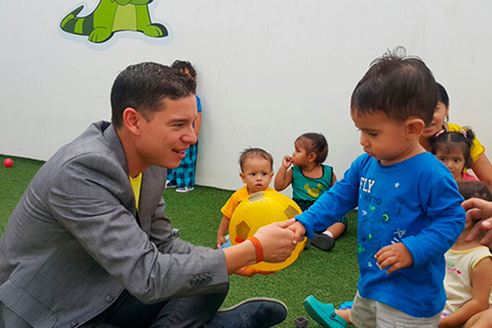 Su visita inició en el CIBV Emblemático “Pequeños Traviesos”, ubicado en el barrio Nuevo Montecristi, donde reciben atención diaria 80 niñas y niños, de 1 a 3 años. El ministro Espinel compartió con los infantes varias actividades lúdicas, conversó con las educadoras del MIES y pudo constatar la calidad del servicio que brinda el ministerio.