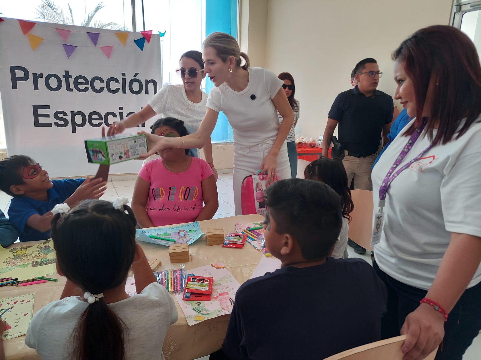 La Primera Dama, Lavinia Valbonesi, visitó este viernes 30 de agosto a 40 niños, niñas y adolescentes que reciben atención en el programa de Erradicación del Trabajo Infantil, que ejecuta el Ministerio de Inclusión Económica y Social (MIES) en el cantón Durán, con quienes compartió un inolvidable momento y a quienes; además, entregó regalos y ropa mientras se desarrollaba un espacio lúdico denominado “La comunidad de mis sueños”.