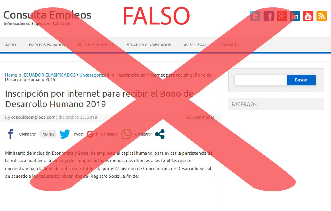 El Ministerio de Inclusión Económica y Social (MIES) informa a la ciudadanía que no existe una página web o portal para inscribirse y acceder al Bono de Desarrollo Humano por Internet. Los anuncios que circulan por facebook y redes sociales para realizar dichas inscripciones son falsos, por lo cual se pide a la ciudadanía realizar cualquier consulta al respecto acercándose a cualquiera de los 58 balcones de servicio del ministerio a nivel nacional, desde las 8:00 hasta las 17:00, de lunes a viernes.