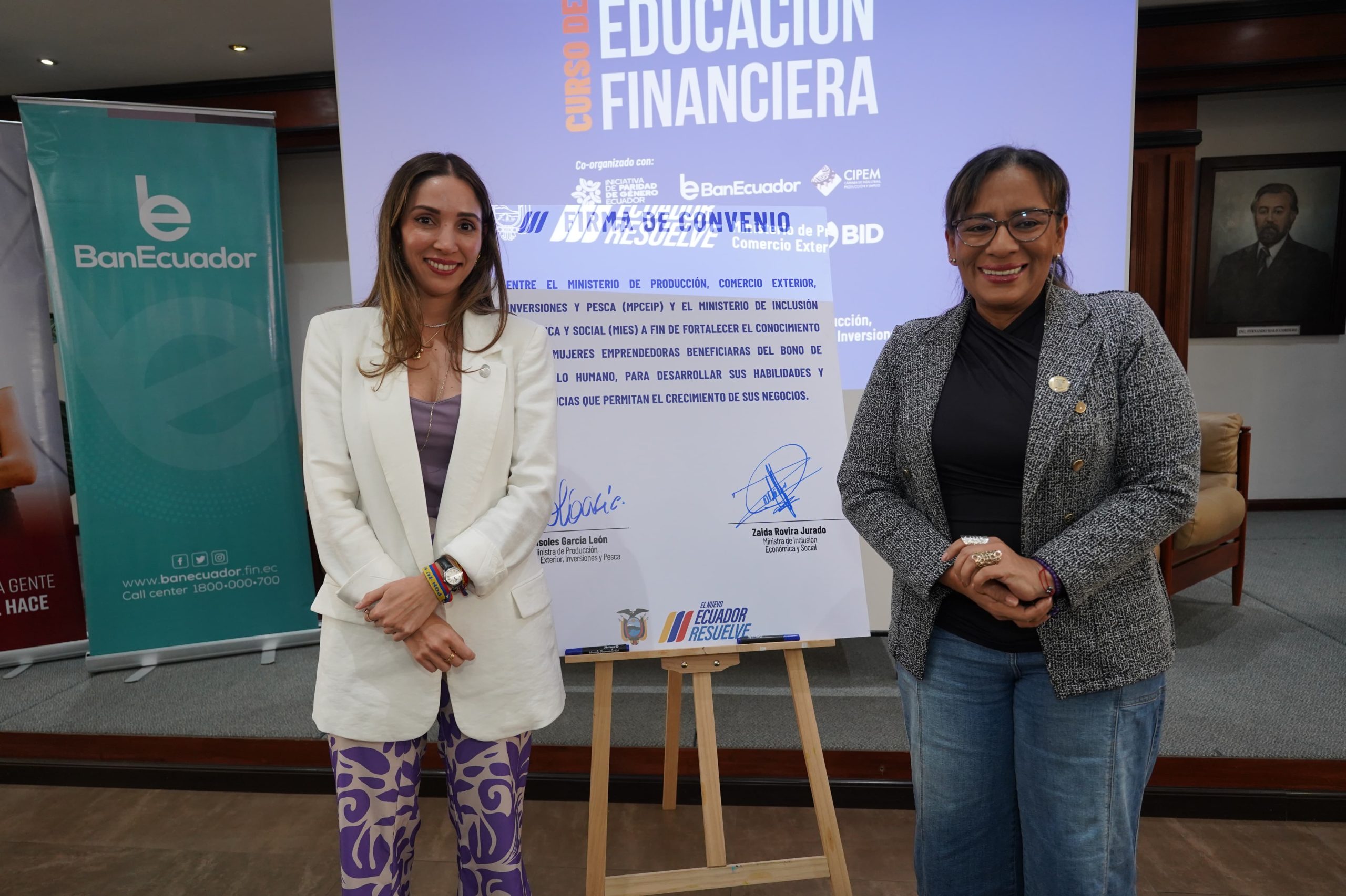 Por otro lado, y como parte de la agenda que cumplió la ministra Rovira en Azuay, este día también firmó un convenio de cooperación interinstitucional con el Ministerio de Producción, Comercio Exterior, Inversiones y Pesca (MIPRO), y en coordinación con el Banco Interamericano de Desarrollo y la Universidad de las Américas, para desarrollar el “Curso de Educación Financiera” y capacitar en materias financieras, productivas, transformación digital y exportaciones a mujeres emprendedoras beneficiarias del Bono de Desarrollo Humano que entrega el MIES.