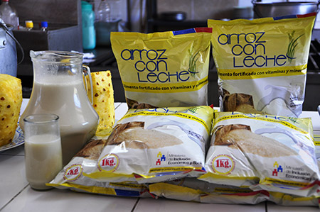 Arroz con leche, es un alimento fácil de preparar, tiene harina de arroz pre-cocida y leche entera en polvo, no necesita que se lo cocine, es un complemento a la alimentación diaria, se puede tomar luego del desayuno, a media mañana y en la tarde antes de merendar.
