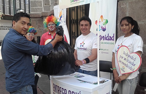 Varios funcionarios públicos que trabajan en el Registro Civil en Riobamba se unieron a la campaña para erradicar la mendicidad y donaron juguetes, caramelos, ropa y alimentos no perecibles en el punto Da Dignidad que está en la Plaza Alfaro.