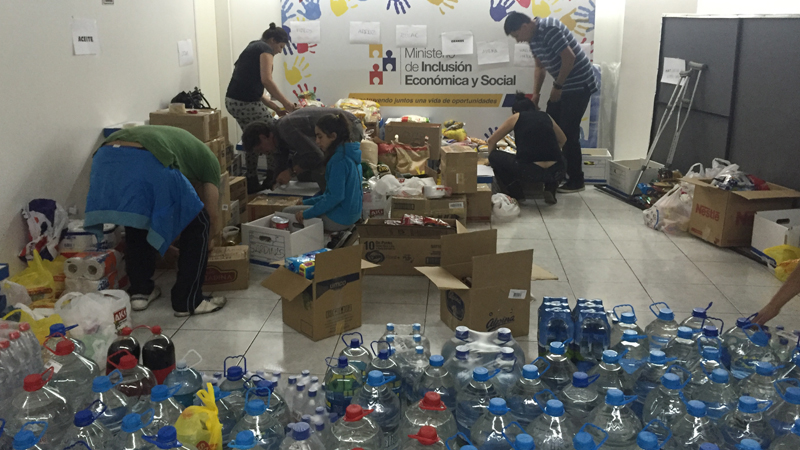 El funcionario del MIES señaló que hasta los puntos de solidaridad están llegando gran cantidad de personas para entregar: agua, enlatados, grados secos, fideo, azúcar, atún, pañales, zapatos. Agregó que esta misma noche llegará un gran contingente de la ayuda recibida por el MIES en los distintos puntos de solidaridad, conjuntamente con mil fundas de ayuda humanitaria que alrededor de 20 funcionarios de este ministerio preparan en las bodegas del Tablón, ubicada al sur de la ciudad de Quito.