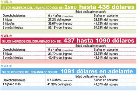Por un hijo la pensión provisional es 86,49 dólares, para dos hijos es 126,15 dólares, lo que equivaldría a 63.07 dólares para cada uno y 165.93 dólares para tres hijos en adelante, que equivaldrían a 55.31 dólares por cada uno de ellos.