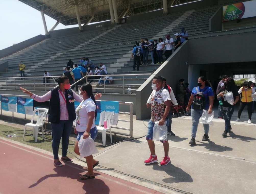 Personal técnico del Ministerio de Inclusión Económica y Social (MIES) brindó apoyo al Ministerio de Salud Pública (MSP), a la Gobernación del Guayas y a otras entidades participantes en esta iniciativa del Gobierno Nacional denominada “Primera Minga de Vacunación Masiva” frente al COVID – 19, que se efectuó este fin de semana en el estadio Chucho Benítez, ubicado en parque Samanes, al norte de Guayaquil.