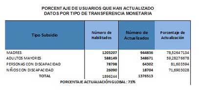 Según las cifras del MIES, el 73% de las personas que reciben el bono y las pensiones asistenciales han actualizados sus datos satisfactoriamente. Del total de madres beneficiarias (1 203 207) el 78,53% ha actualizado sus datos, el 59,28% de los adultos mayores (588 149) ha realizado la actualización, el 81,60% de las personas con discapacidad (78 798) y el 71% de niños y niñas (26 090) con discapacidad también han realizado la actualización.